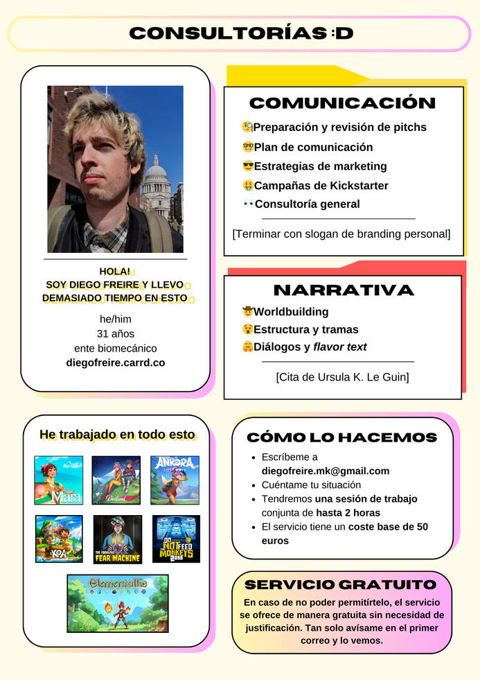 Soy Diego Freire y llevo demasiado tiempo trabajando de esto.Tras años trabajando en distintos juegos, tanto en la parte de comunicación y marketing como en narrativa, he decidido ofrecer mis servicios en abierto. Si sois un equipo indie, un solodev o tan solo alguien que necesita una mano en alguno de estos ambitos, no dudes en ponerte en contacto conmigo.